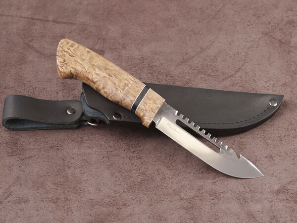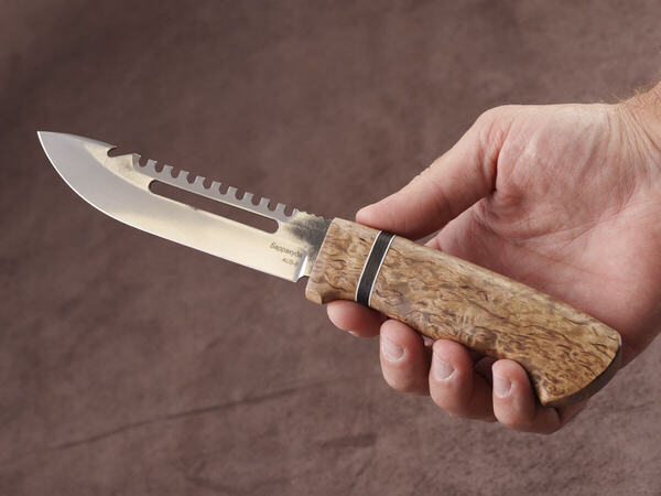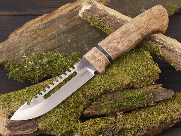 Клинок ножа выполнен из высокопрочной японской стали AUS 8. Сплав устойчив к ударным нагрузкам и излому, слабо подвержен коррозии и легок в заточке, что делает его идеальным материалом для изготовления охотничьих и кухонных ножей.