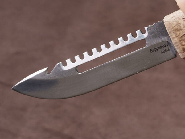 Лезвие из AUS 8 долго держит остроту и имеет устойчивую кромку, которую можно заточить до бритвенной остроты. Твердость ножа после закалки составляет клинка 56-57 HRC.