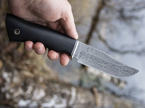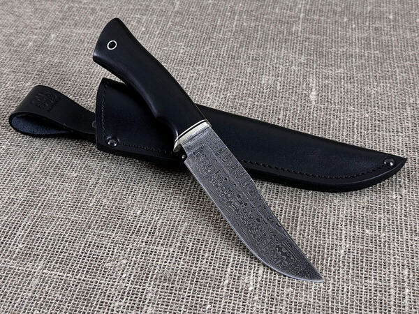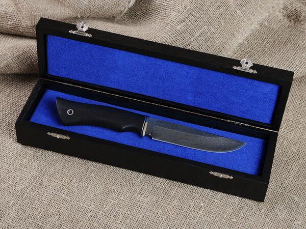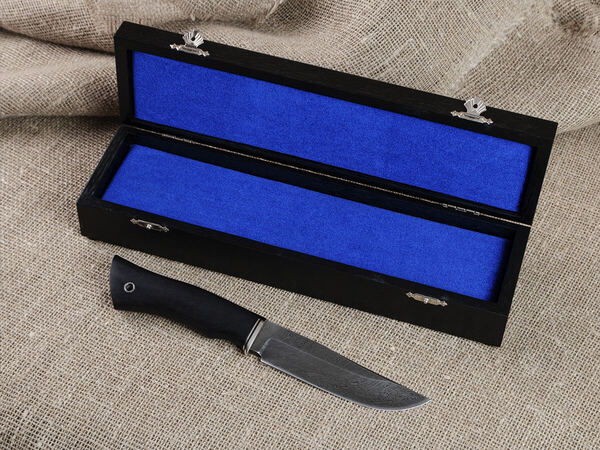 Клинок ножа выполнен из легендарной дамасской стали, отличающейся исключительной прочностью и остротой, а рукоять сделана из «корабельного дерева» – черного мореного граба, неподверженного воздействию влаги. Нож универсальный, компактный, удобный, хорошо держит заточку и готов справиться с любой задачей в лесу или на даче.