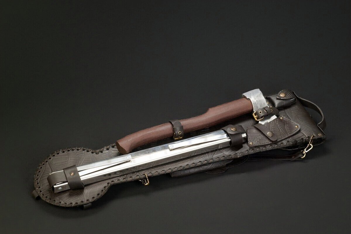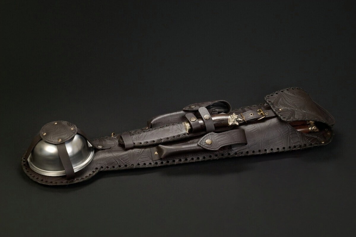 Все предметы размещаются в чехле из натуральной кожи. Он прошивается и оплетается вручную, украшен тиснением и удобен для хранения и транспортировки.
