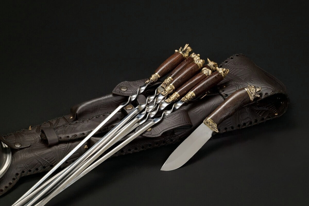 В набор входит раскладной мангал и 6 шампуров «Звери Лесные». Рабочая часть шампуров выполнена из нержавеющей стали, угловая, толщиной 2 мм и длиной 550 мм — прочные и удобные в использовании. Рукояти изготовлены из древесины африканского венге, а навершия шампуров с головами лесных зверей выполнены из латуни методом художественного литья, что делает каждый шампур настоящим произведением искусства.