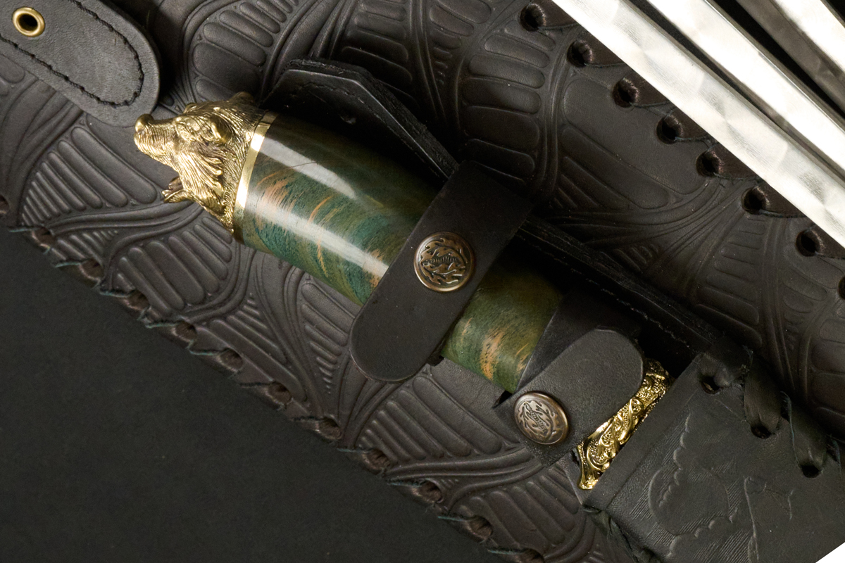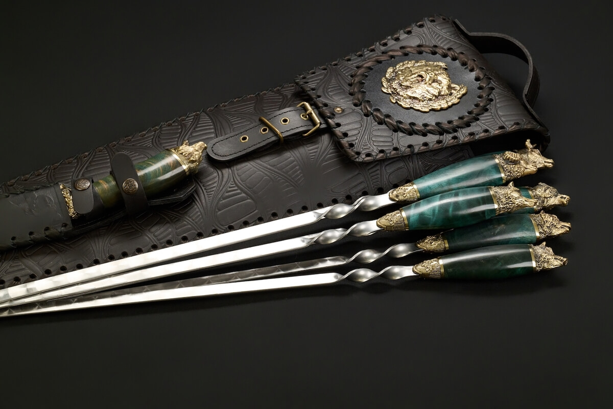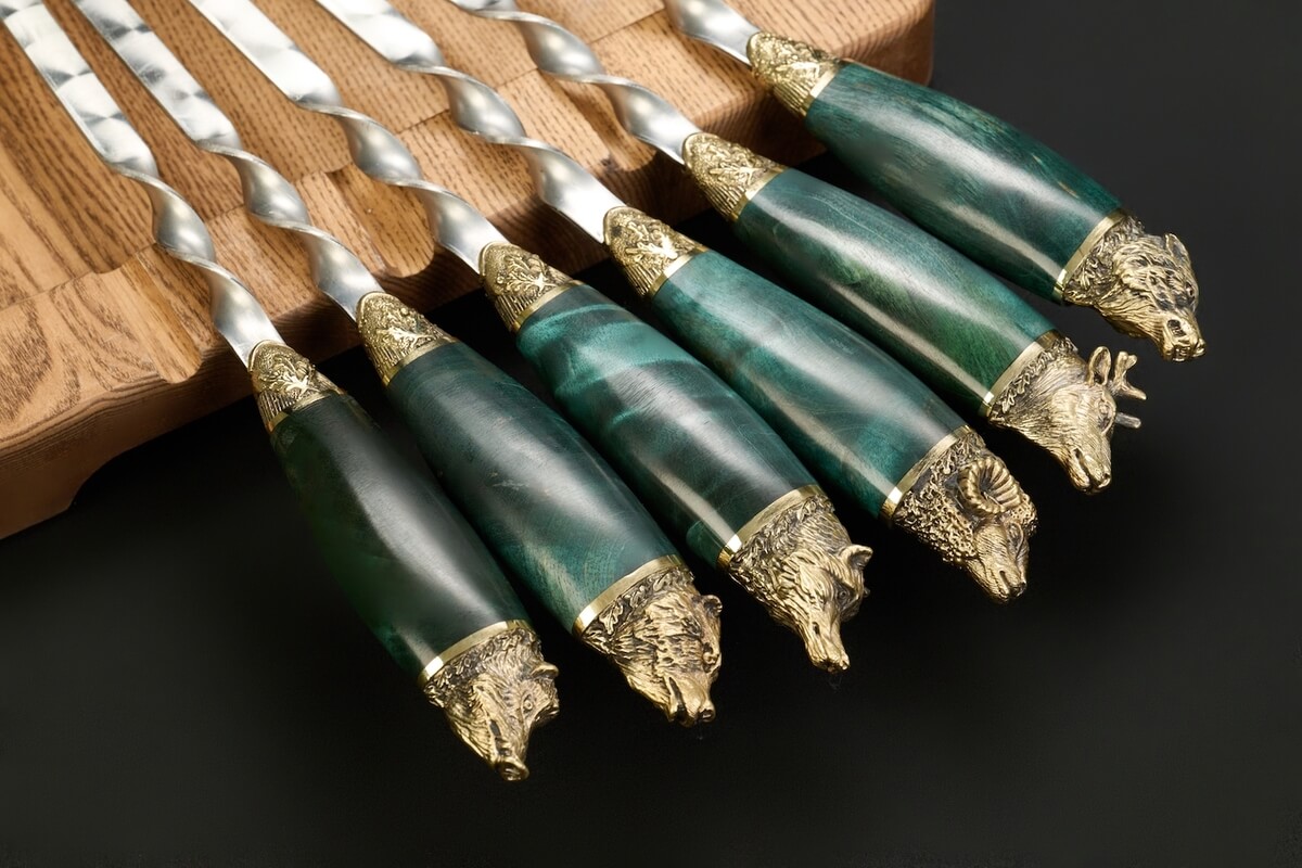 Рукояти изготовлены из карельской берёзы насыщенного зелёного оттенка и дополнены навершиями с головами лесных зверей, которые выполнены из латуни методом художественного литья. Выразительная текстура древесины в сочетании с детально проработанными латунными элементами создаёт эффектный образ и подчёркивает премиальный характер набора, превращая приготовление на мангале в особый ритуал загородного отдыха.