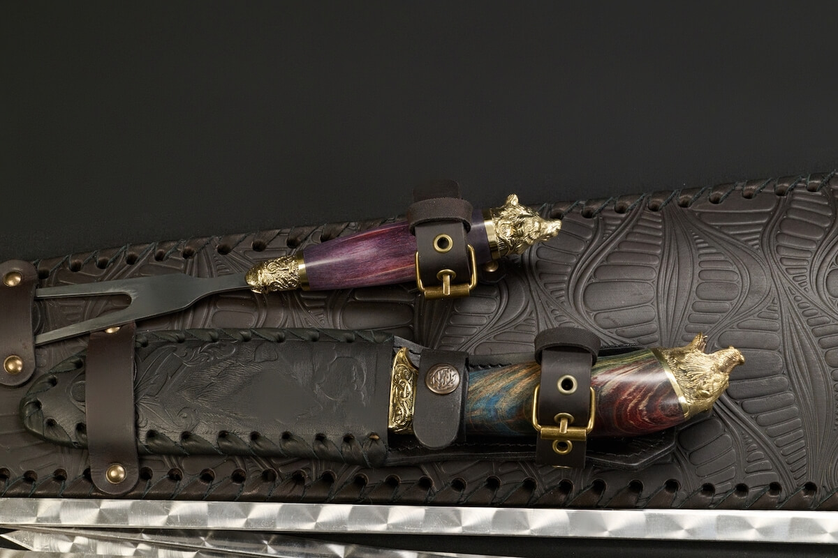 Рукояти украшены фигурными навершиями из латуни, созданными методом художественного литья с последующим покрытием патиной. Патинирование придает изделиям эффект состаренного металла и наделяет их дополнительной элегантностью и шармом.