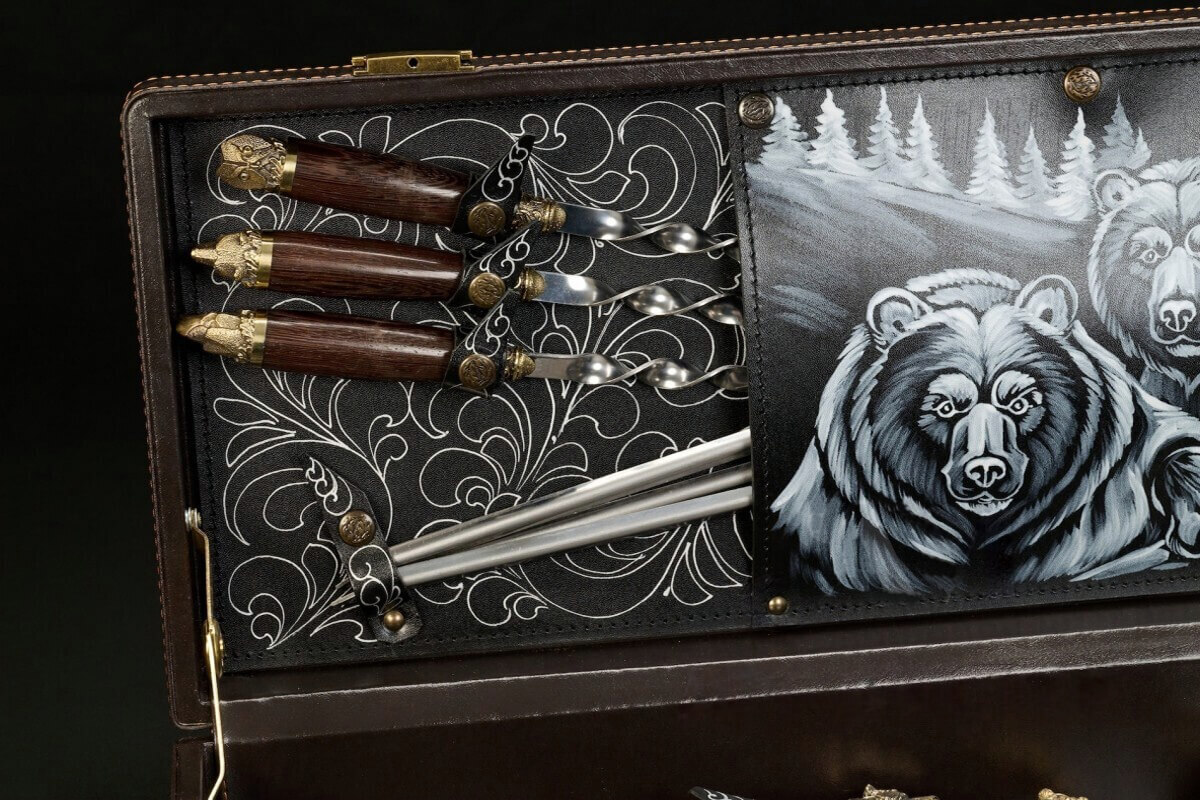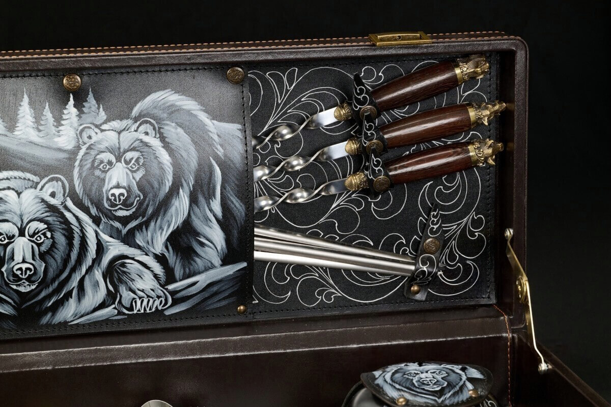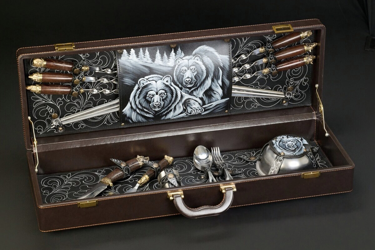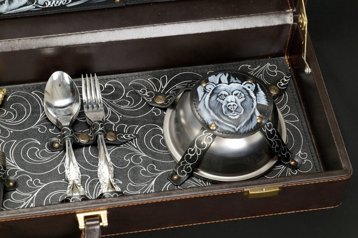 Все предметы аккуратно размещаются в футляре из экокожи. Внутреннее пространство организовано так, чтобы каждый элемент находился на своём месте и надёжно фиксировался. Качественная отделка, тематические авторские рисунки, нанесённые методом пирографии и продуманная компоновка делают кейс удобным для хранения и транспортировки. Такой набор приятно вручать в подарок и с гордостью открывать в компании друзей.