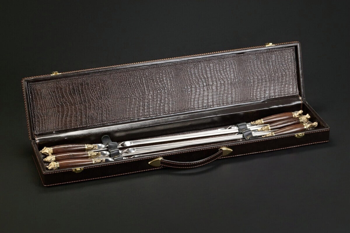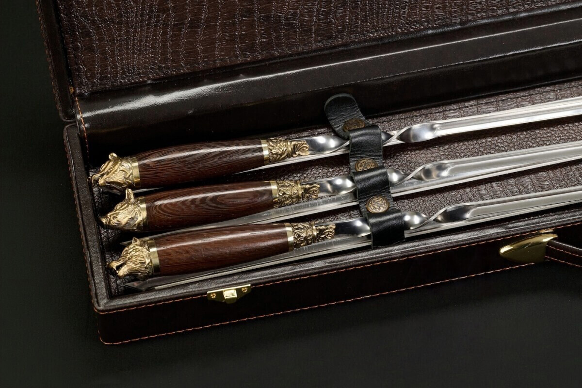 Подарочный набор шампуров в кейсе «Звери Лесные» станет достойным подарком для человека, который любит отдых на природе и ценит красивые, качественные вещи. Шампуры украшены рукоятями из венге — древесины с глубоким, благородным оттенком. Элементы художественного литья в виде голов лесных зверей придают набору характер и делают его заметным на любом пикнике или дачном столе.
