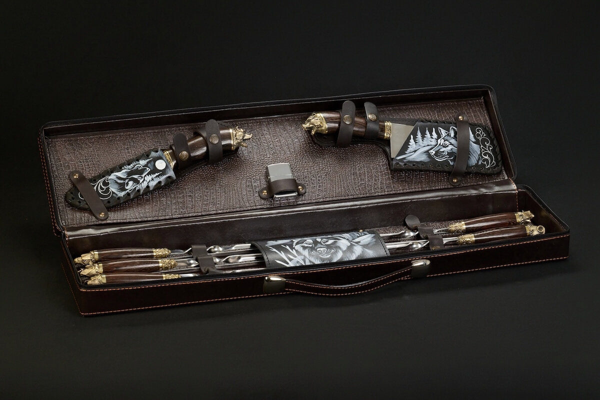 Такой комплект невозможно не заметить на пикнике или в загородном доме. «Волк №3» станет впечатляющим подарком для мужчины, который любит готовить на огне, выезжать на природу и ценит вещи с характером. Он будет радовать владельца на каждой встрече у мангала — на даче, на охоте или в компании друзей.