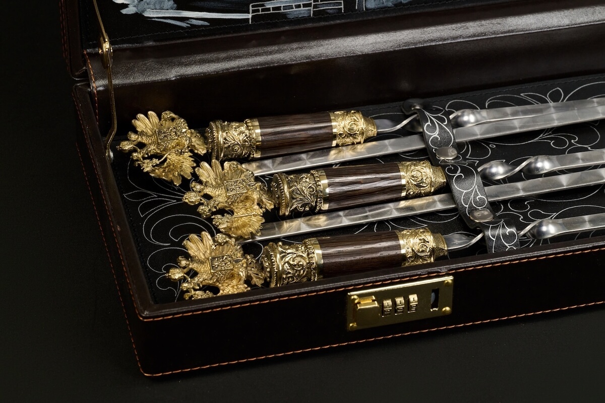 Навершия из латуни с символикой герба РФ и рукояти из венге создают гармоничный и выразительный образ набора. Продуманные детали подчёркивают премиальный характер комплекта и делают его по-настоящему запоминающимся, превращая каждый элемент в сочетание эстетики и функциональности.