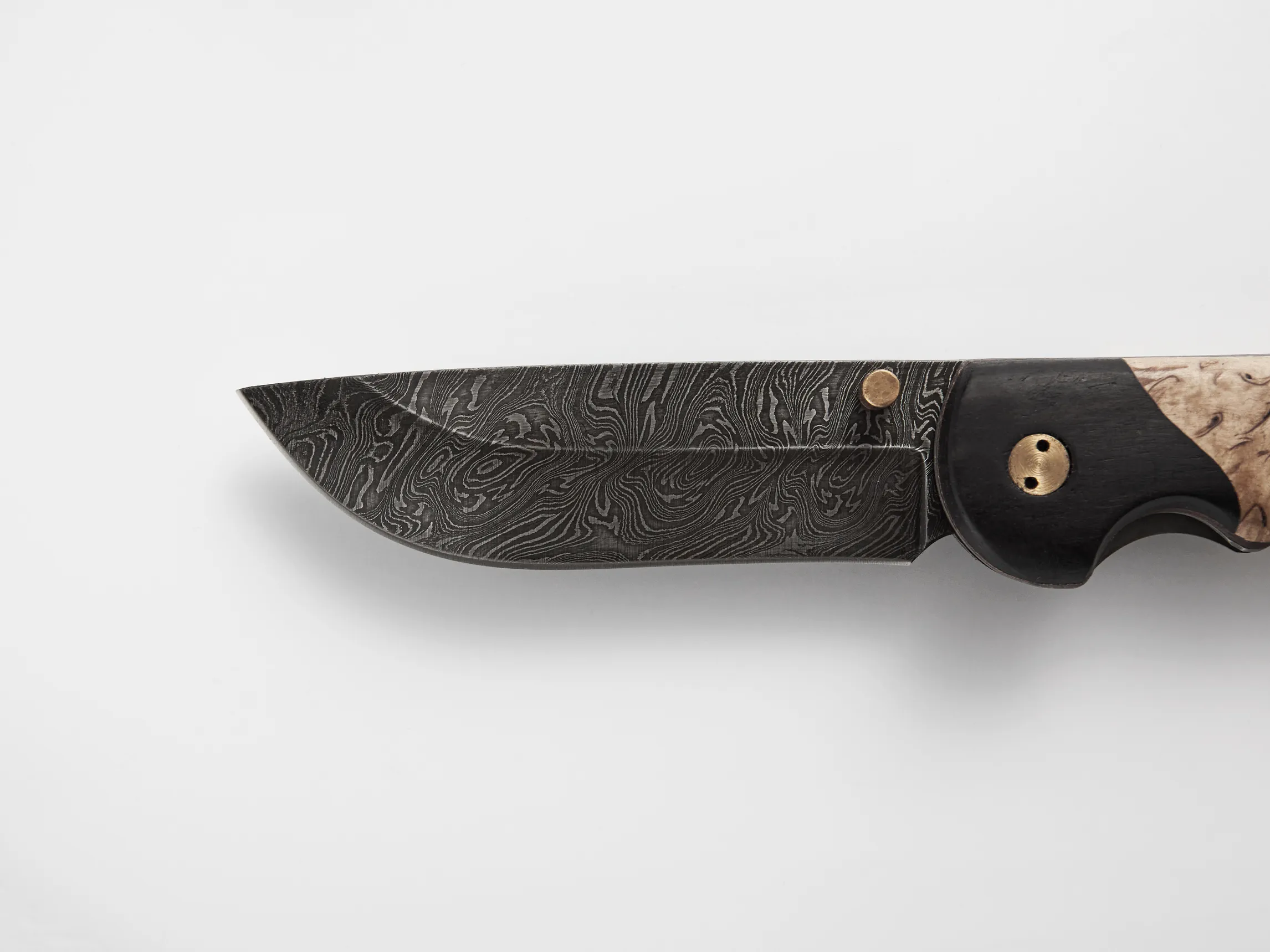Рукоять выполнена из сочетания карельской берёзы и чёрного граба. Такое комбинирование создаёт выразительный контраст: светлая текстура древесины с природным рисунком сочетается с тёмными плотными вставками.