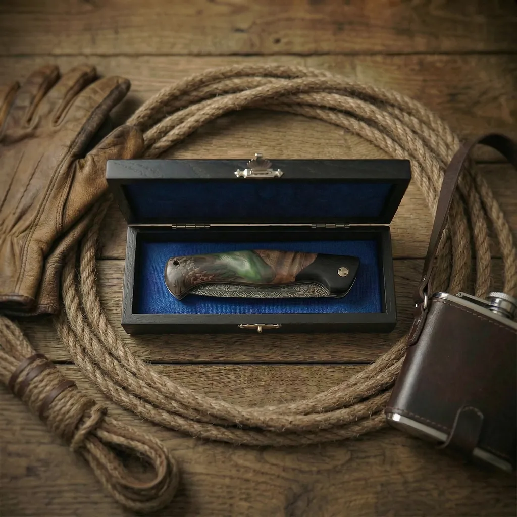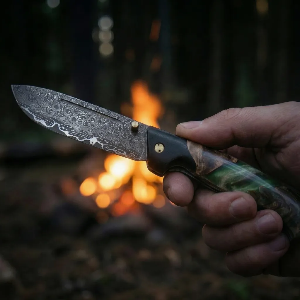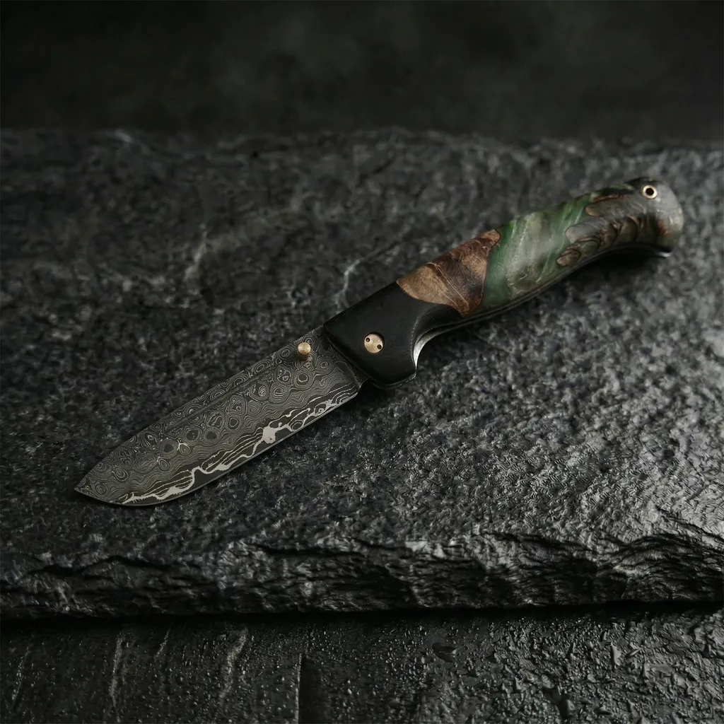 Складной нож «Таежник» ручной работы с клинком из ламинированной стали и комбинированной рукоятью из чёрного граба, кавказского ореха и зелёного акрила. Выразительный рисунок клинка подчёркивает слоистую структуру стали, а рукоять с залитой в акрил сосновой шишкой делает каждый нож визуально уникальным.
