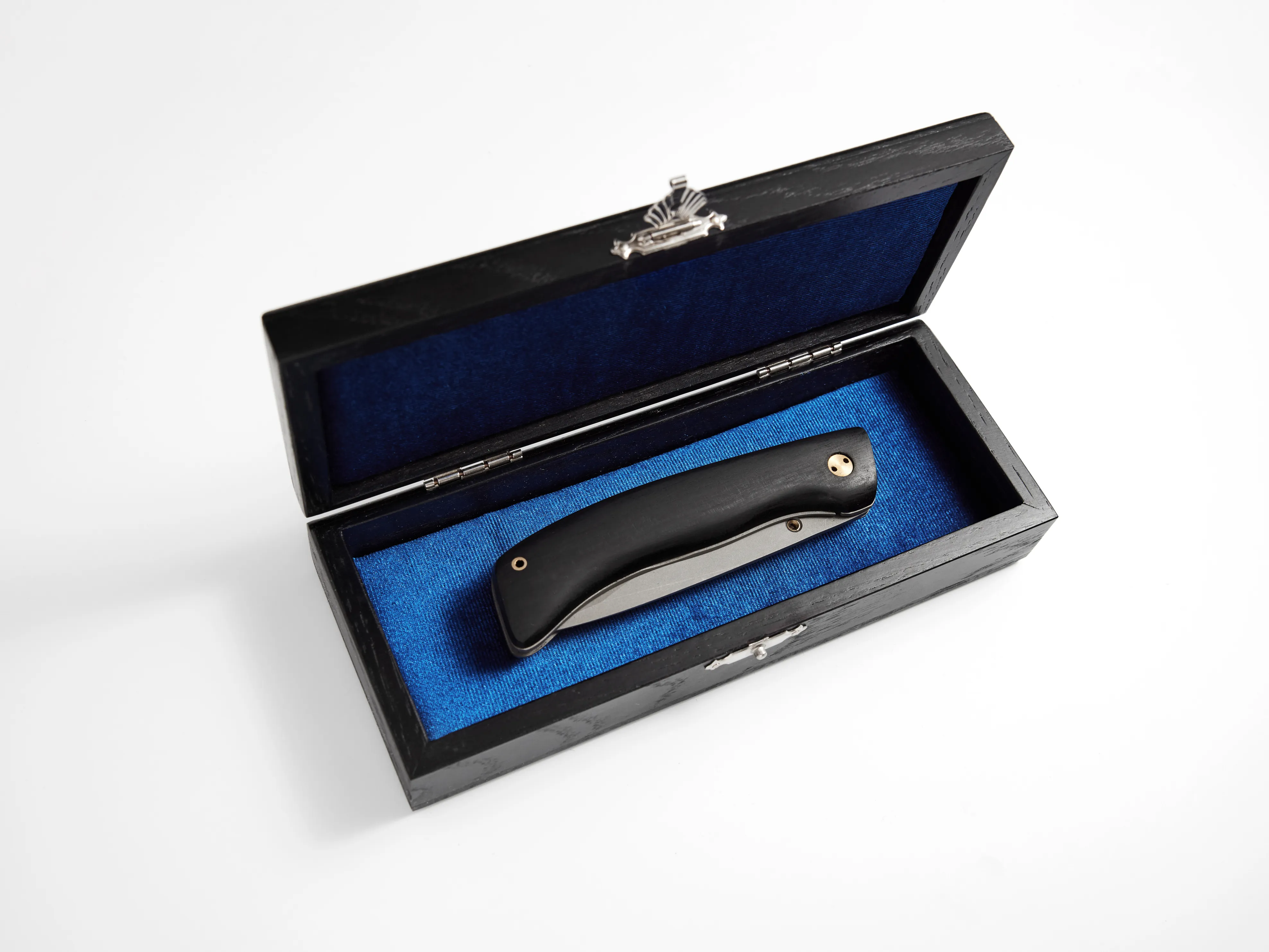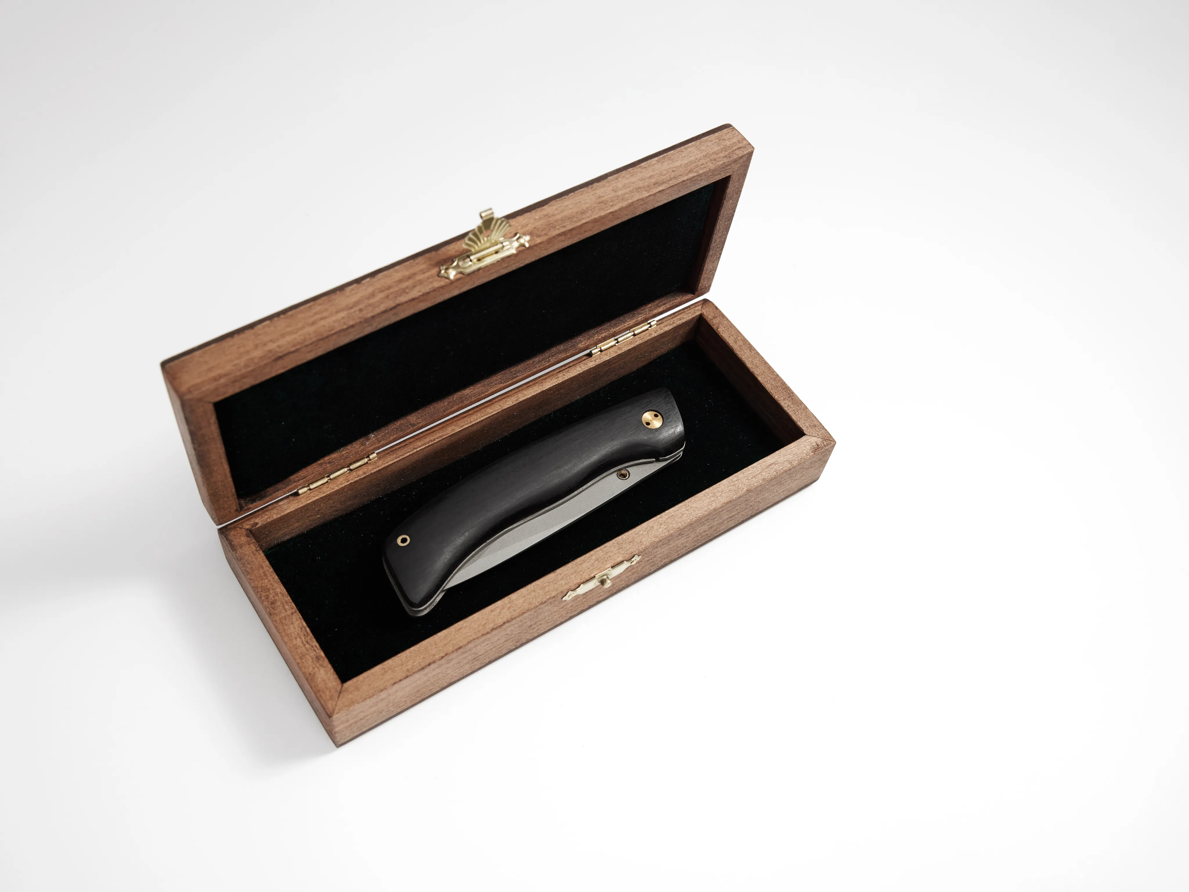 По желанию нож можно дополнить подарочной шкатулкой из бука или дуба. Такой вариант хорошо подходит для подарка и делает подачу более завершенной.