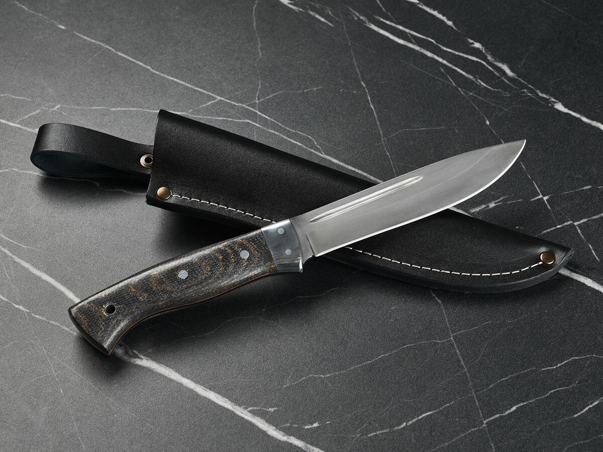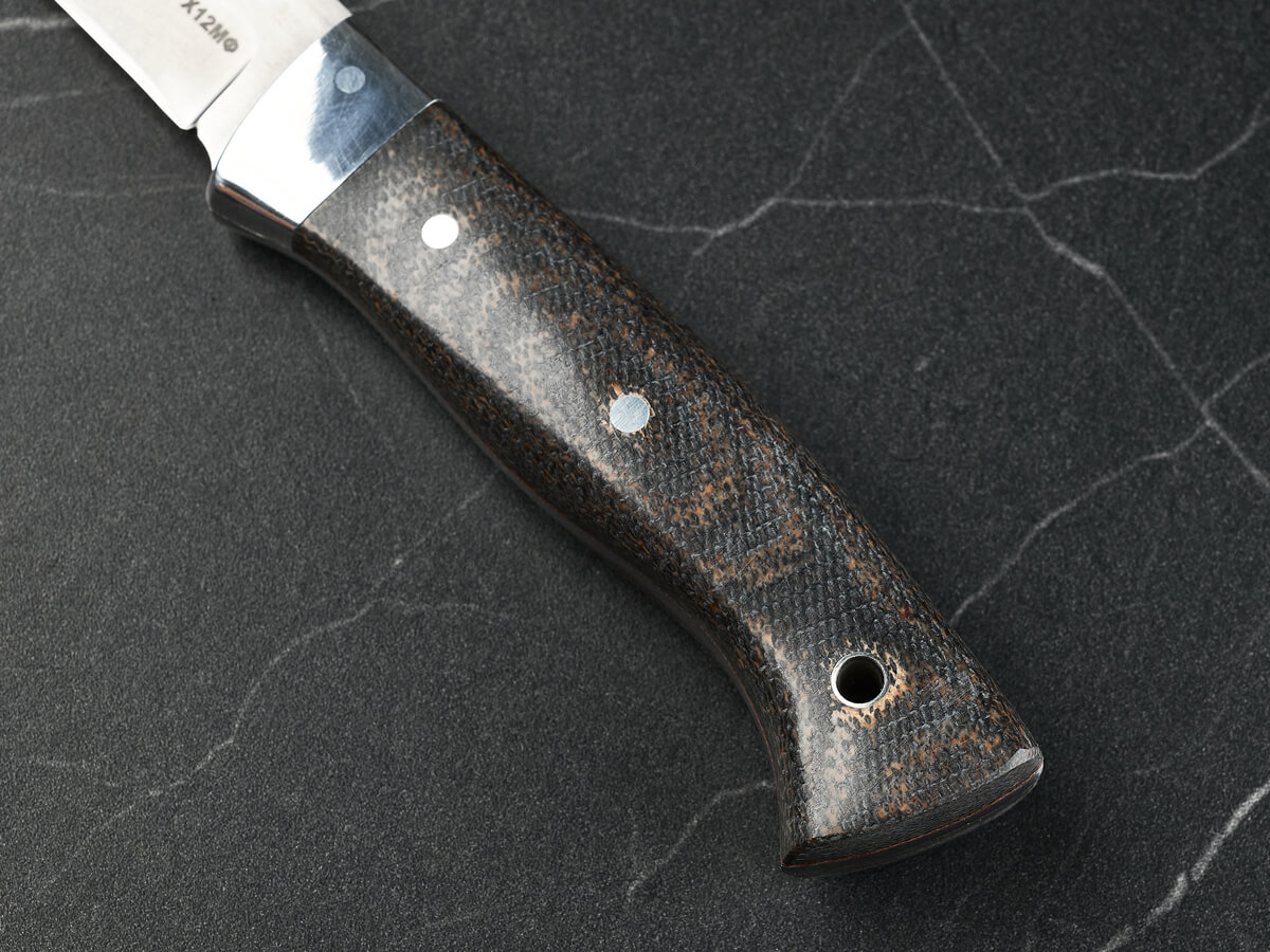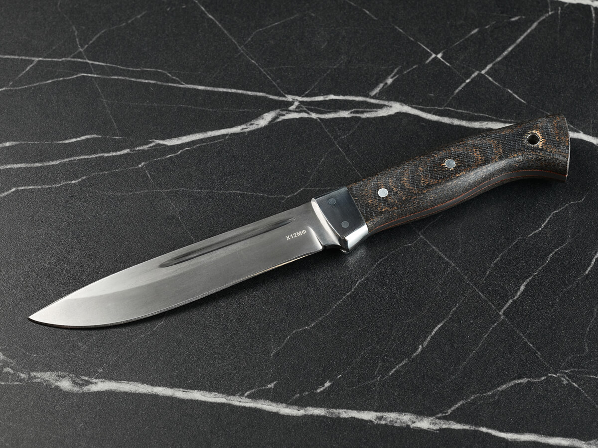 Клинок ножа выполнен из высокоуглеродистой кованой стали Х12МФ, что гарантирует отличный рез при высоких и длительных нагрузках. Х12МФ – прочная и износостойкая сталь. Клинки из такой стали долго держат заточку, поэтому ее широко используют в изготовлении охотничьих и кухонных ножей.