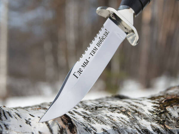 Нож представляет собой конструктивно точную реплику холодного оружия морских пехотинцев. Его строгая и благородная форма соответствует воинскому духу мужества, достоинства и чести. На тыльнике ножа расположена символика пограничных войск, на голомень клинка нанесен боевой девиз морской пехоты.