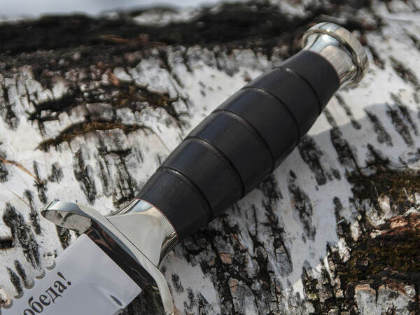 Развитая гарда и тыльник рукояти выполнены из мельхиора. Этот материал устойчив к внешней среде, со временем не темнеет и не окисляется.