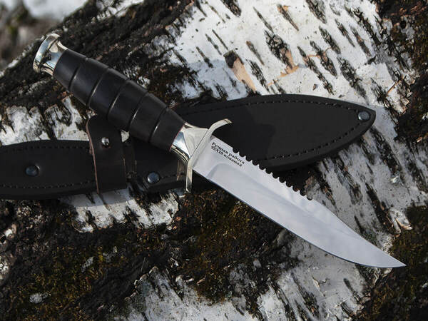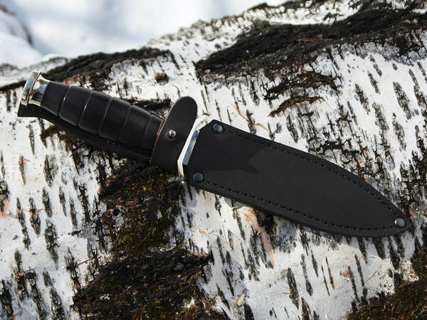 К изделию прилагаются ножны из натуральной кожи с подвесом для ношения на поясе и кнопочным хлястиком, страхующим от потери. Нож в таких ножнах плотно упакован, удобен в переноске, не вываливается и не болтается при тряске. Кожа окрашена в черный цвет, аккуратно прошита и проклепана, хорошо держит форму и приятна на ощупь.
