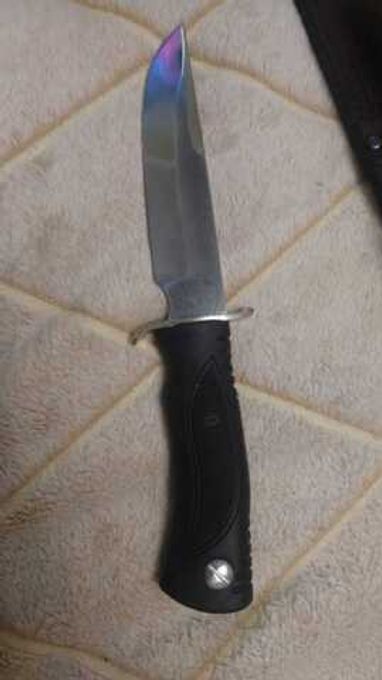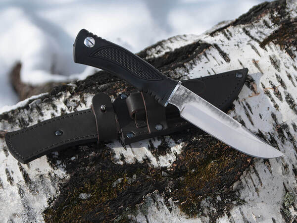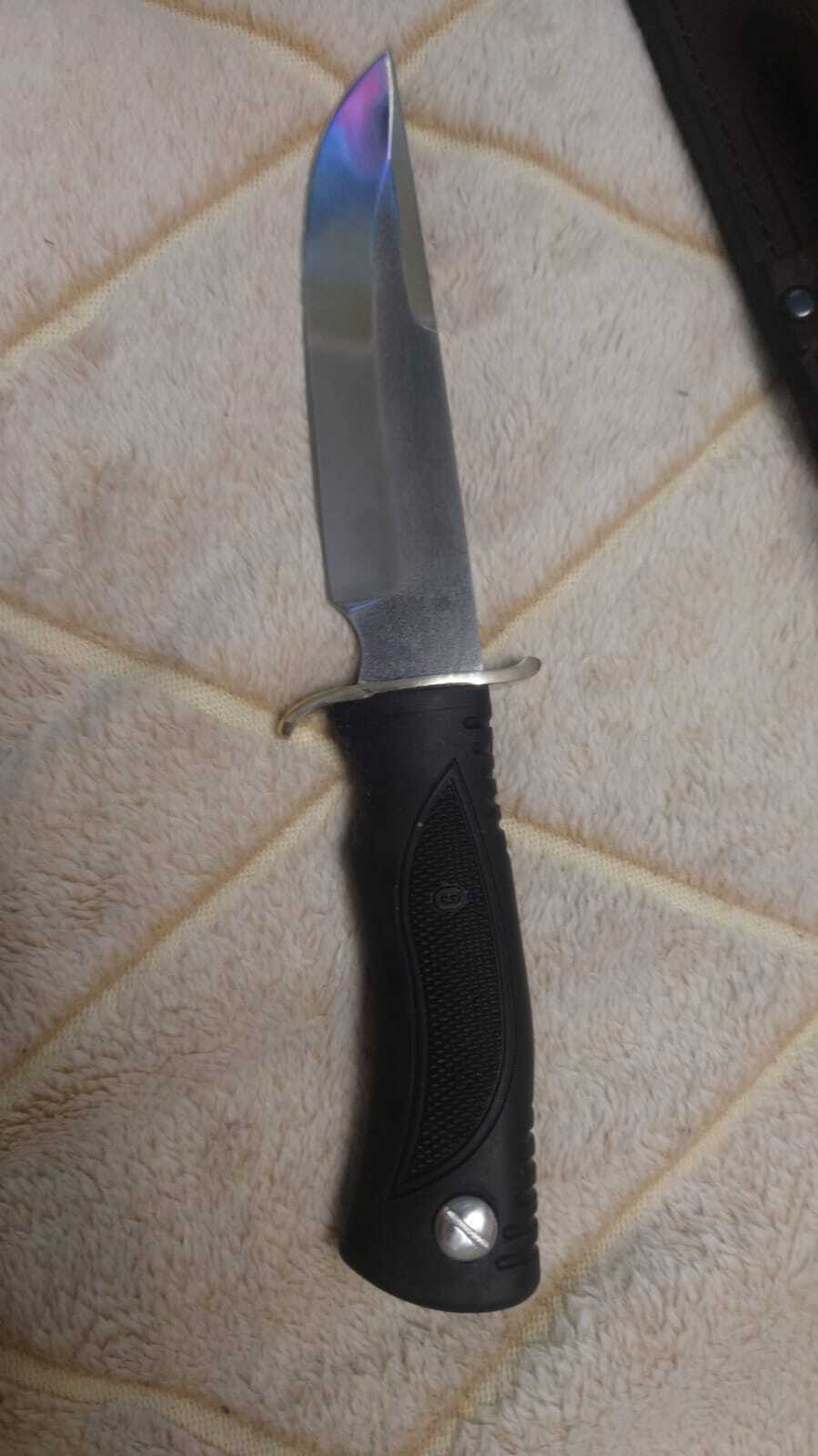 К изделию прилагаются ножны из толстой натуральной кожи с подвесом и кнопочным хлястиком, страхующим от потери. Нож в них плотно упакован, удобен в переноске, не вываливается и не болтается при тряске. Кожа окрашена в черный цвет, аккуратно прошита и проклепана, хорошо держит форму и приятна на ощупь.