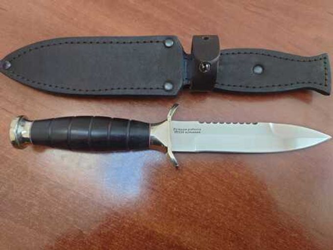 К изделию прилагаются ножны из натуральной кожи с подвесом для ношения на поясе и кнопочным хлястиком, страхующим от потери. Нож в таких ножнах плотно упакован, удобен в переноске, не вываливается и не болтается при тряске. Кожа окрашена в черный цвет, аккуратно прошита и проклепана, хорошо держит форму и приятна на ощупь.