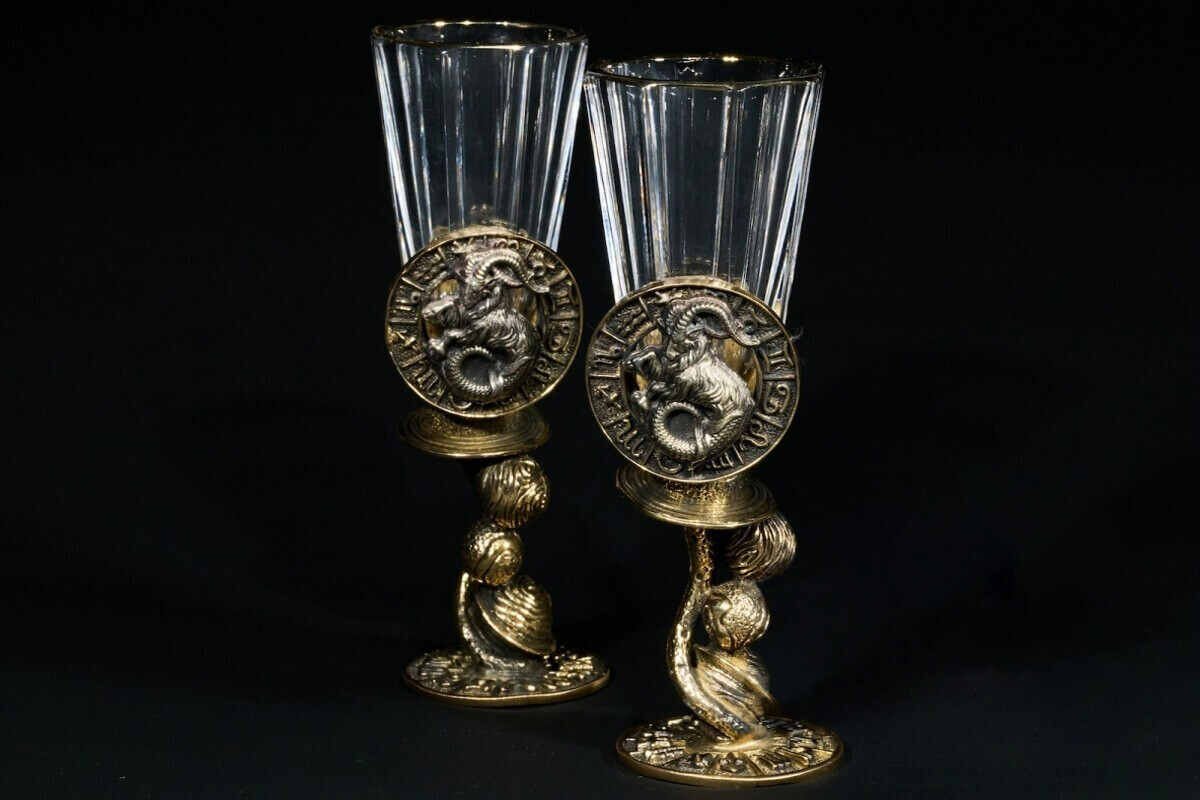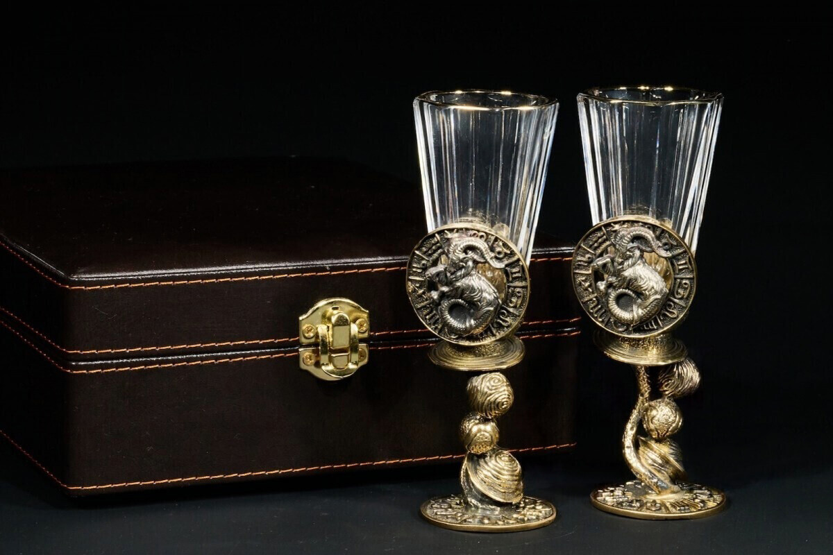 Акцентом этого подарочного набора является искусно выполненное художественное литье из патинированной латуни, которым оформлен каждый из лафитников. Оцените мастерство автора, который передал в металле мельчайшие детали знака зодиака.
