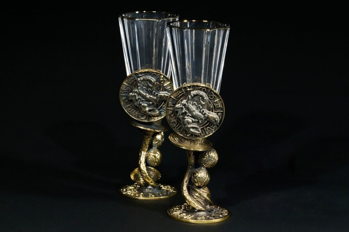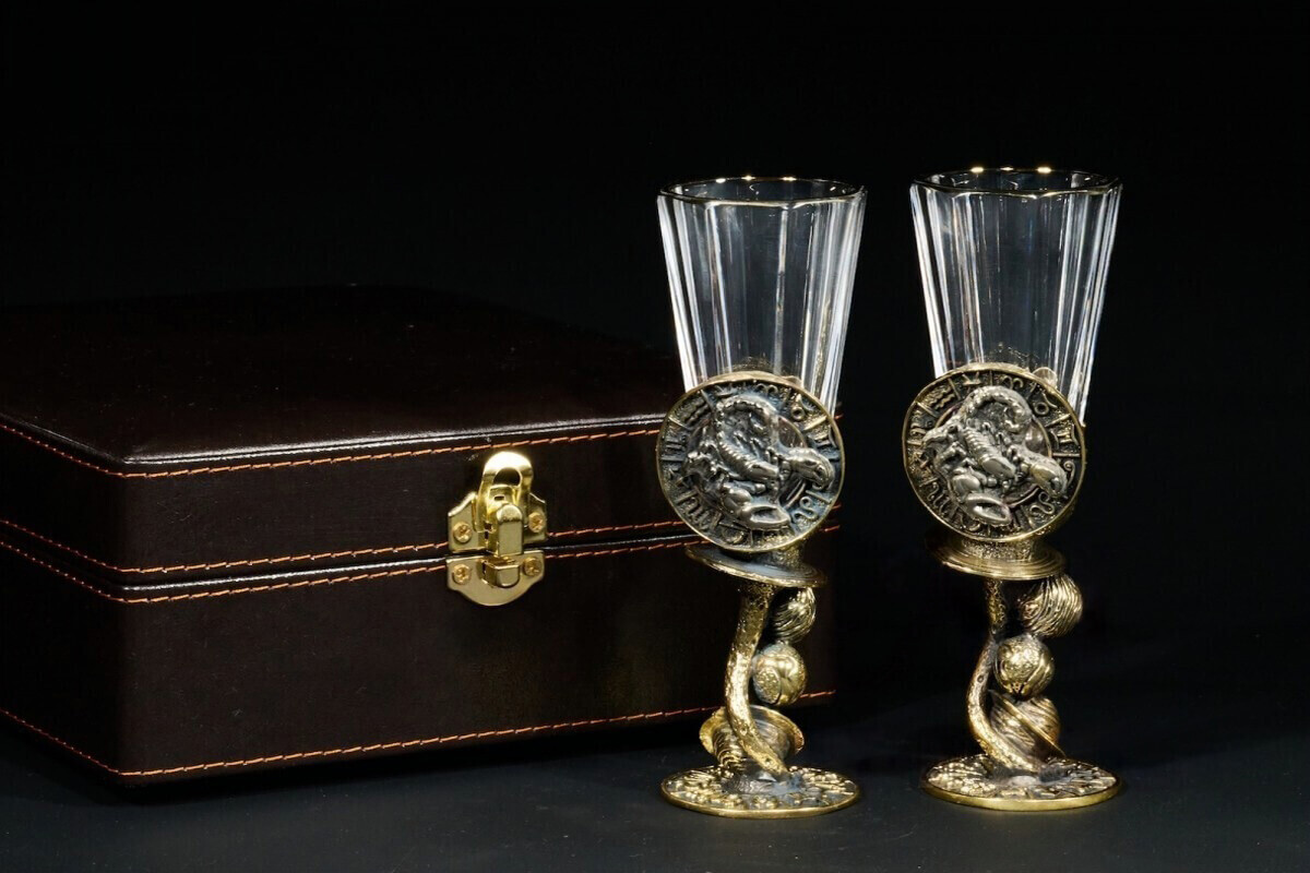 Акцентом этого подарочного набора является искусно выполненное художественное литье из патинированной латуни, которым оформлен каждый из лафитников. Оцените мастерство автора, который передал в металле мельчайшие детали знака зодиака.