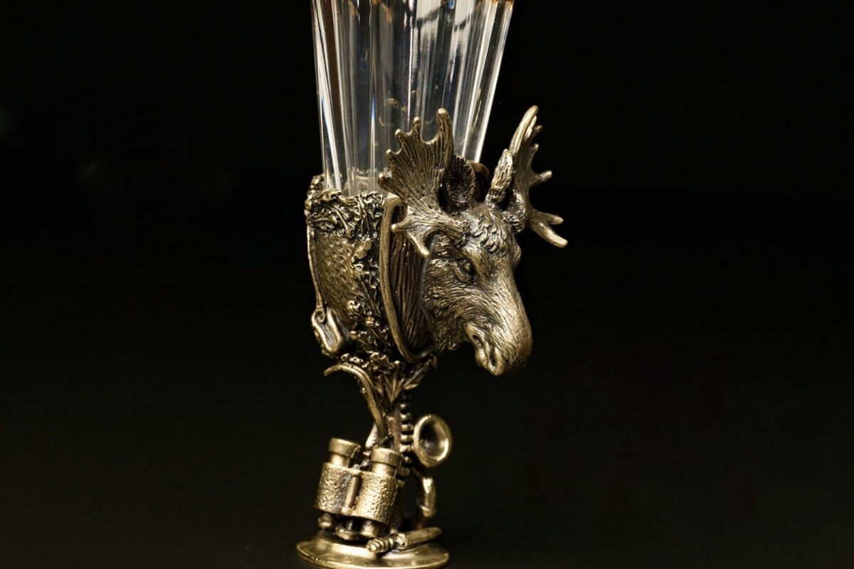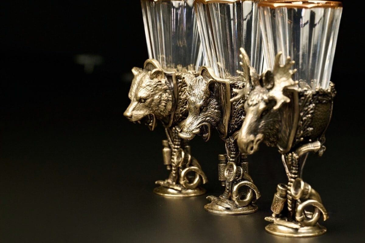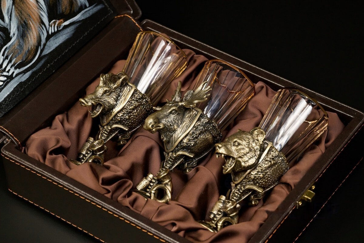 У этого подарочного набора яркий мужской характер. Акцентом является искусно выполненное художественное литье из патинированной латуни, которым оформлен каждый из лафитников. Оцените мастерство автора, который передал в металле мельчайшие детали.