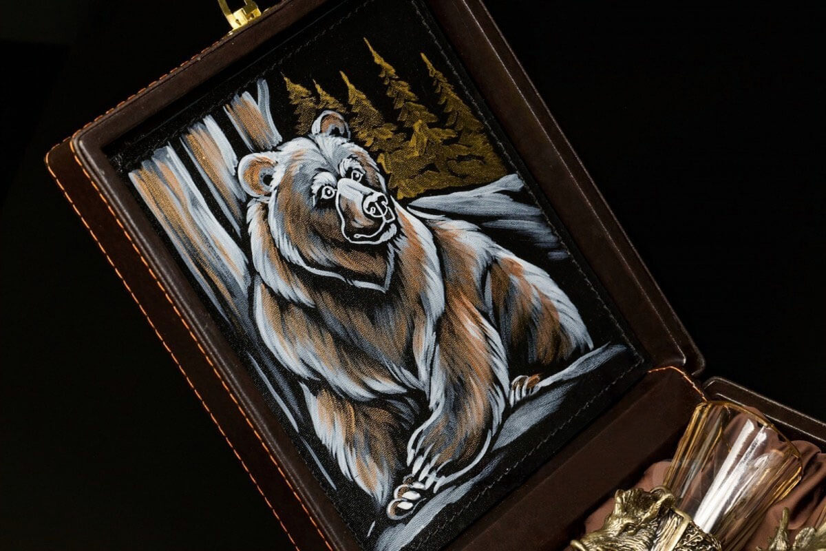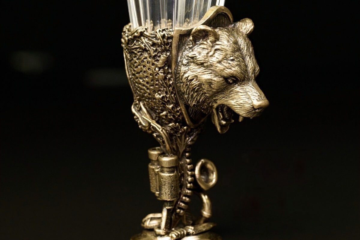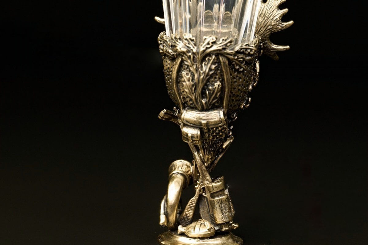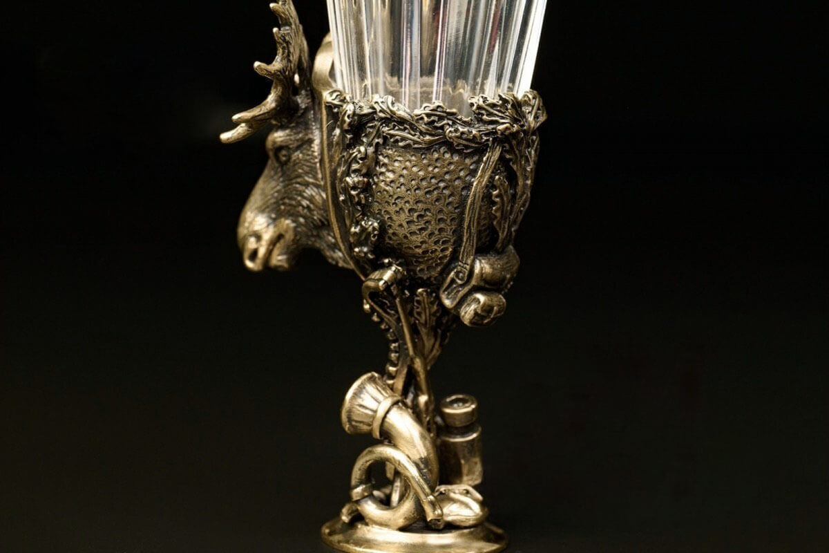У этого подарочного набора яркий мужской характер. Акцентом является искусно выполненное художественное литье из патинированной латуни, которым оформлен каждый из лафитников. Оцените мастерство автора, который передал в металле мельчайшие детали.