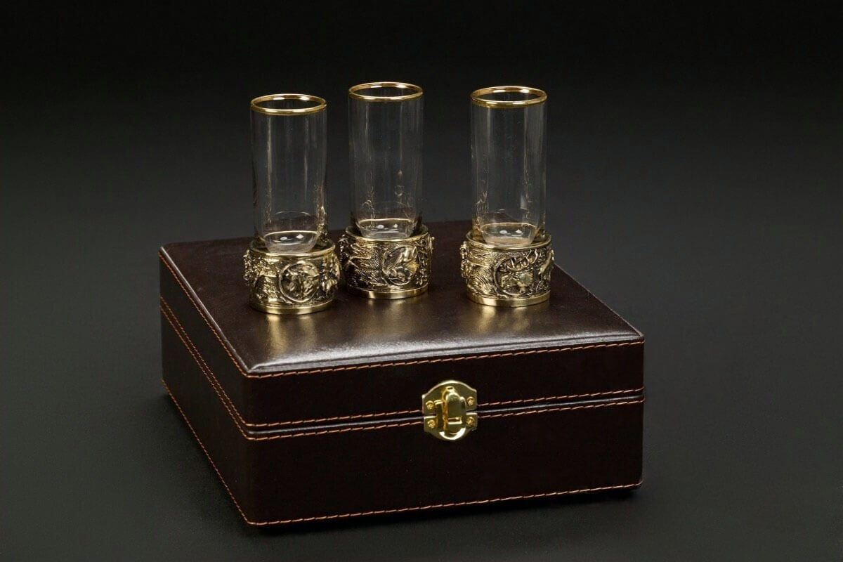 Стопки имеют классическую форму, которая наилучшим образом подходит для дегустации напитка. Пить из такой посуды  – особый вид удовольствия. В комплектацию набора "Охота" входит подарочный кейс с художественным оформлением. Внутренний ложемент отделан коричневым атласом , идеально подходящим для этих оригинальных стопок.