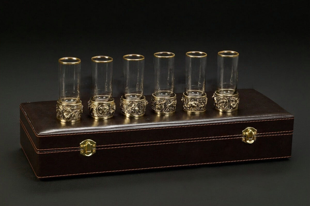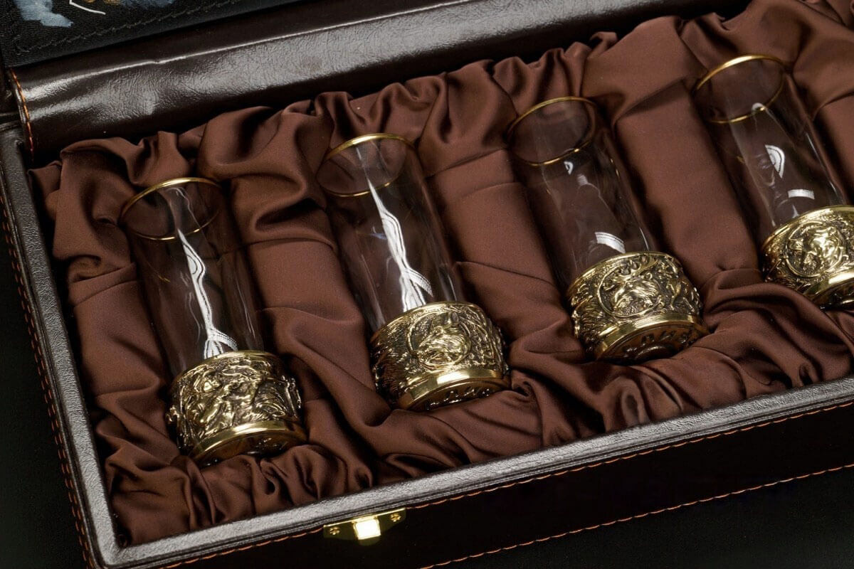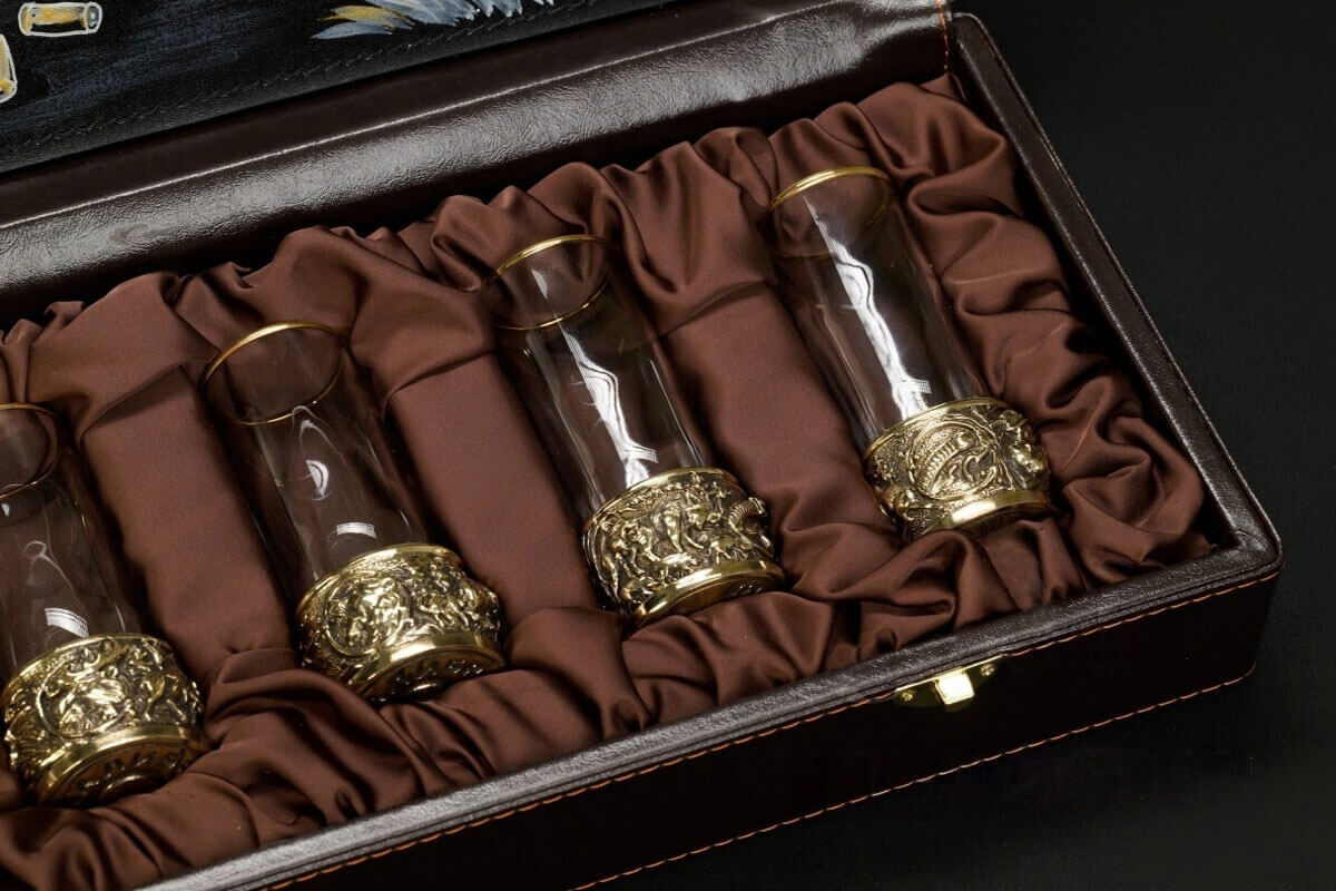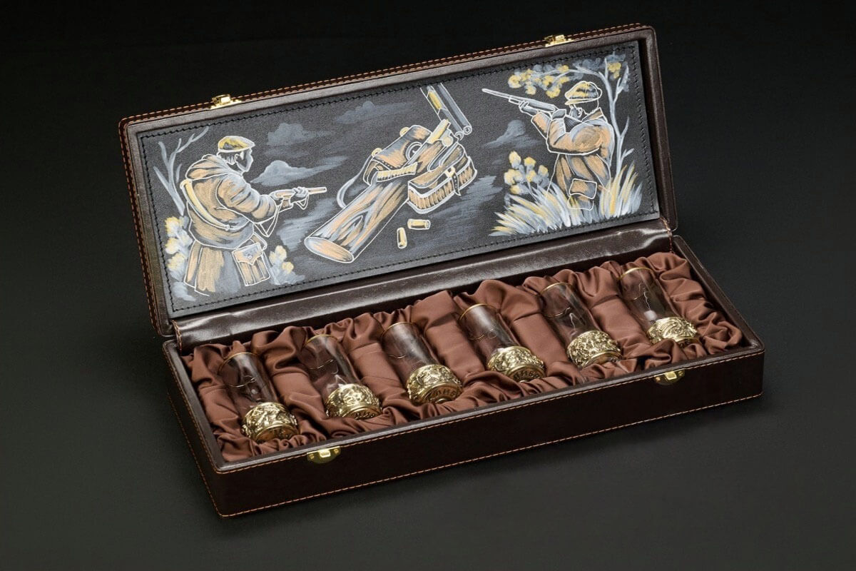 Стопки имеют классическую форму, которая наилучшим образом подходит для дегустации напитка. Пить из такой посуды  – особый вид удовольствия. В комплектацию набора "Охота" входит подарочный кейс с художественным оформлением. Внутренний ложемент отделан коричневым атласом , идеально подходящим для этих оригинальных стопок.