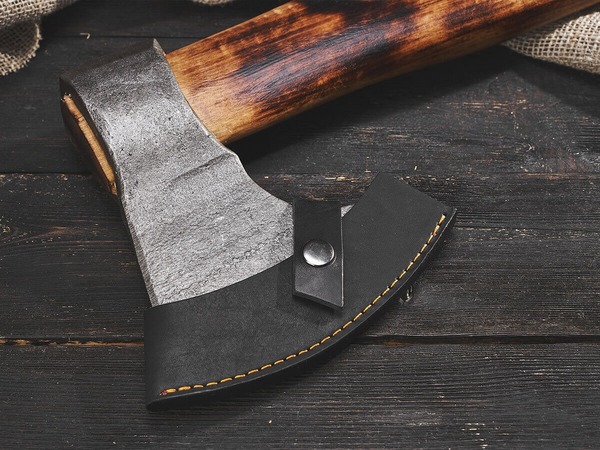К изделию прилагаются ножны из натуральной кожи, крепящейся ремешком на кнопке. Ножны делают топор более безопасным при хранении и переноске. Толстая, хорошо прошитая кожа надежно защищает лезвие от ржавчины и повреждений.
