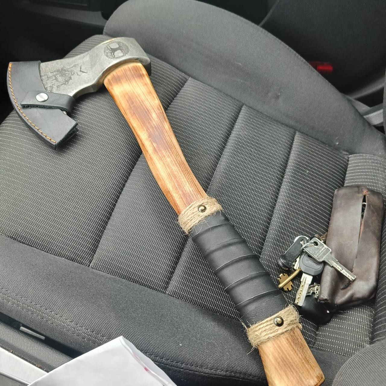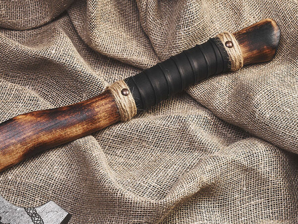 Рукоять из березы легкая и теплая на ощупь, удобна по форме и хорошо лежит в руке. Оплетка из кожи и джутовой веревки улучшает хватку и придает изделию брутальный вид.