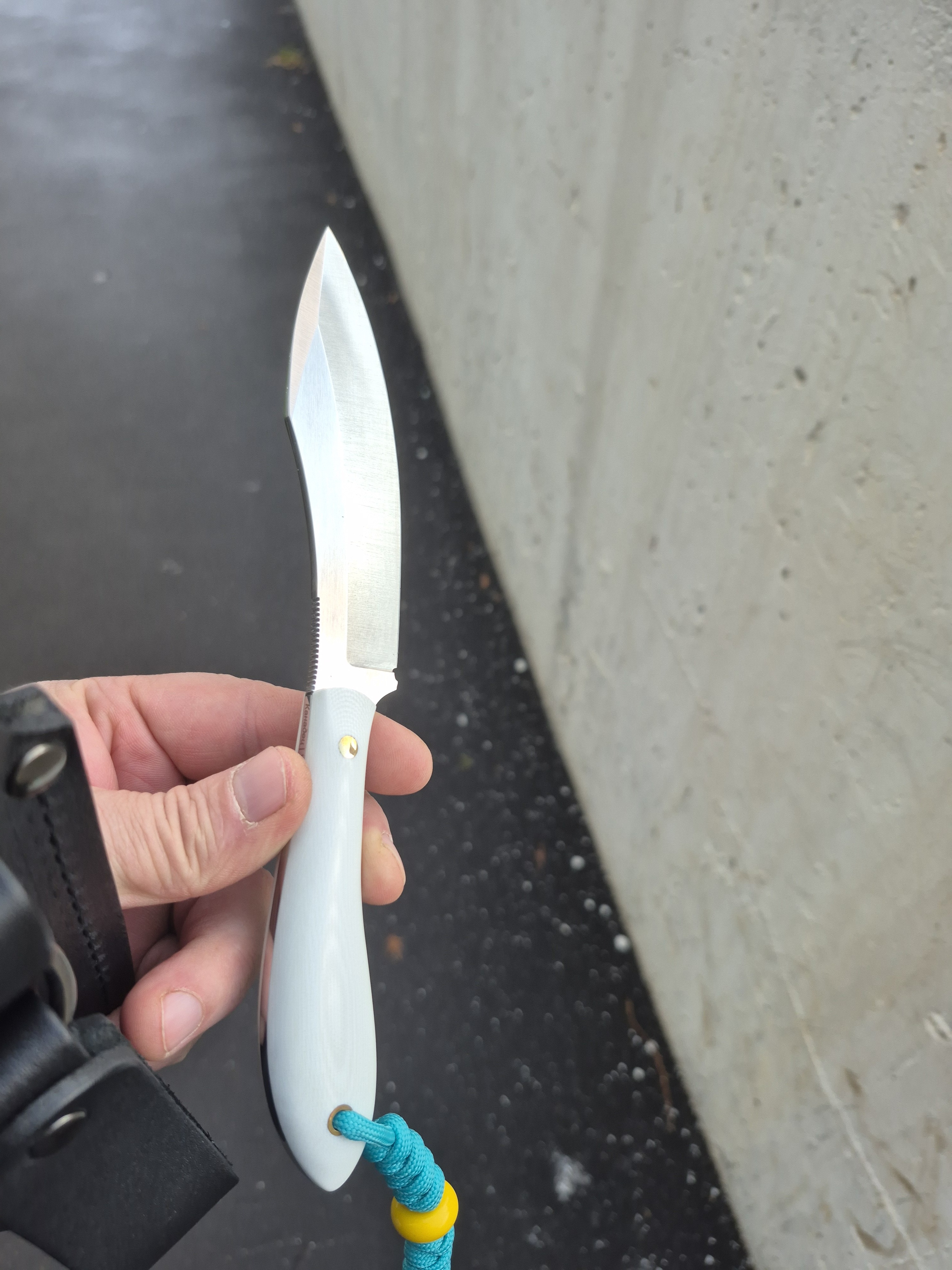 «Канадец» имеет необычный силуэт с листовидным клинком, поставленным под углом к рукояти. Снежная белизна накладок, подчеркнутых красным спейсером, делает нож особенно красивым и легко заметным на природе.