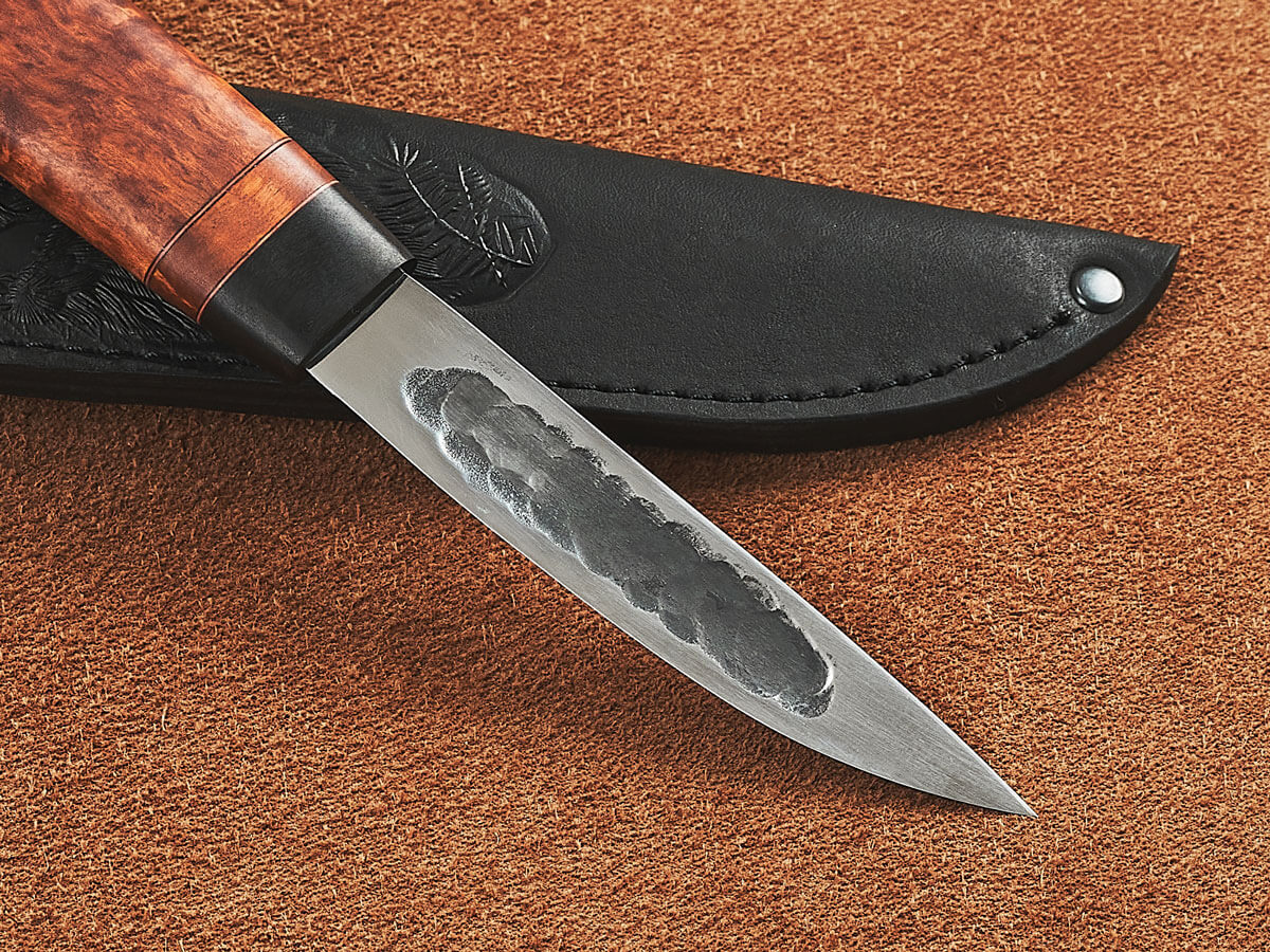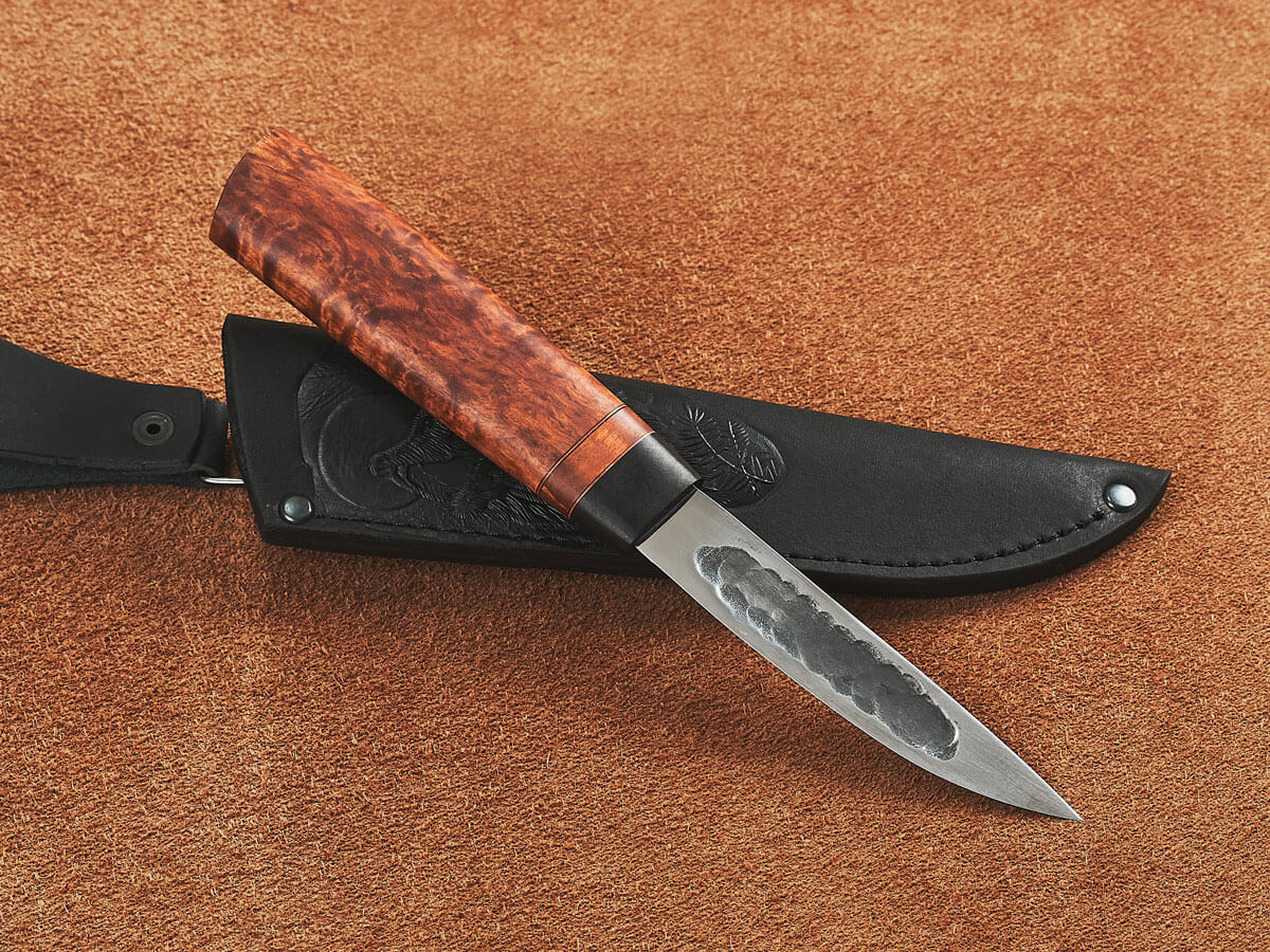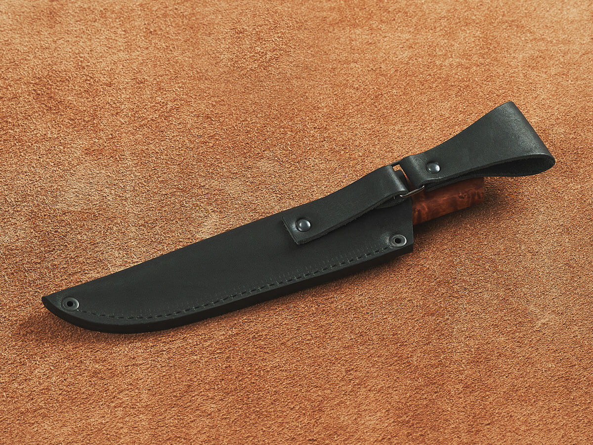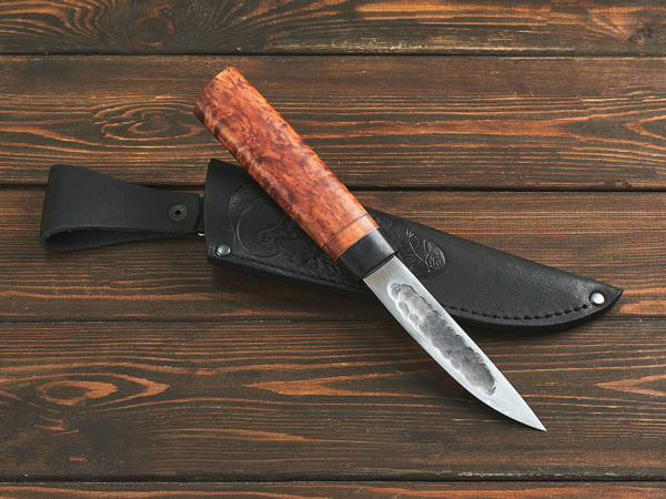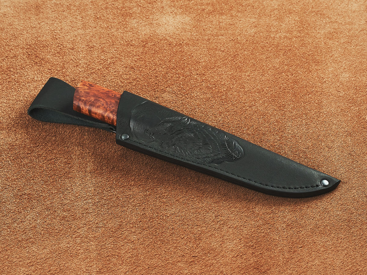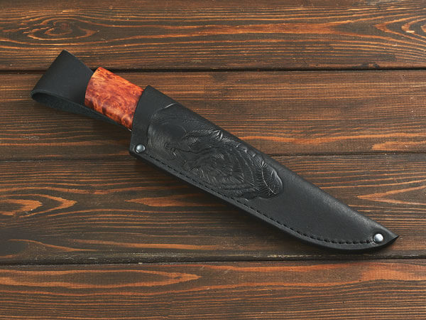 Нож оснащен крепкой рукоятью из мореной карельской березы – красивого прочного материала, который не боится влаги и холода, не рассыхается, не трескается на морозе и умеет удерживать тепло даже при минусовой температуре. По сравнению с обычной мореная древесина отличается особой монолитной прочностью за счет долго пребывания в воде и имеет более темный и насыщенный цвет.