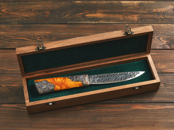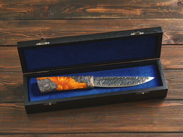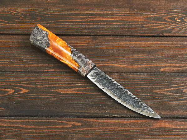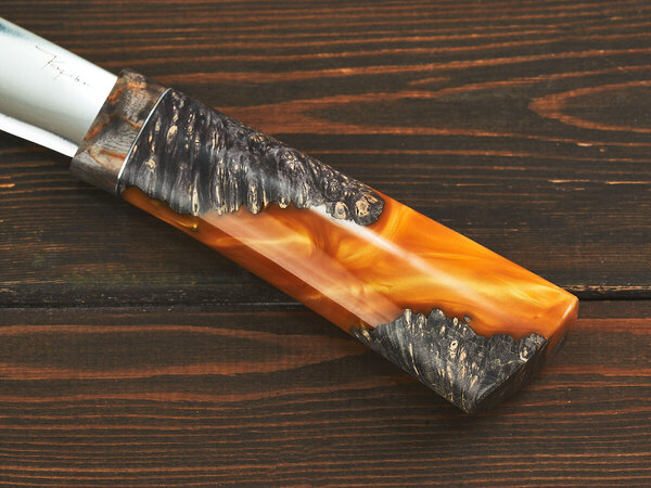 Янтарный акрил напоминает застылый солнечный свет: внутри видны мягкие завихрения и медовые переливы, которые играют при каждом движении ножа. Благодаря природному рисунку берёзы и сложной структуре акрила каждый нож получает собственный характер — будто пойманный в материале луч солнца, превращённый мастером в настоящее произведение искусства.