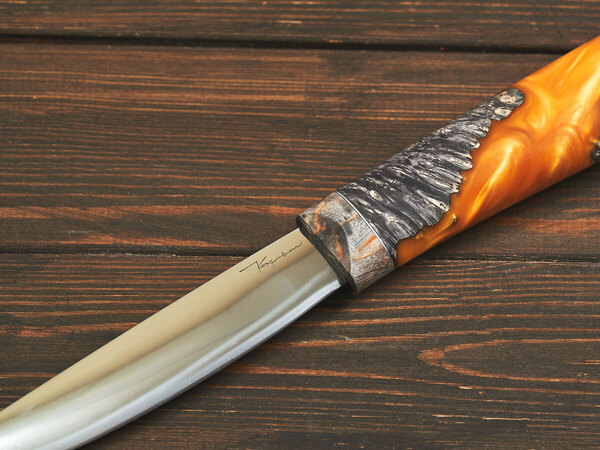 Рукоять этого якутского ножа создана из стабилизированной карельской берёзы в пепельном цвете и акрила тёплого янтарного оттенка. Древесина пропитана горячим льняным маслом — это усиливает её прочность, защищает от влаги и сохраняет стабильность формы даже при активном использовании. Рукоять надёжно лежит в руке, не скользит и приятно греет ладонь в прохладную погоду.