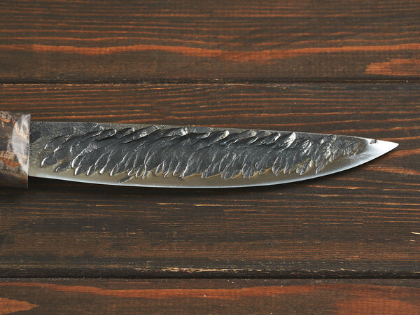 Нож доводится мастером до с исключительной остроты из прочной кованой стали Х12МФ. Твердость стали составляет 60-61 HRC.