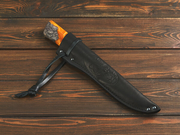 Ножны, прилагаемые к изделию, сделаны из натуральной кожи и имеют подвес для ношения на поясе. Каждый шов тщательно прошит и проклепан мастером: нож надежно фиксируется, не выпадает и не болтается даже при тряске. Внутренний фиксатор предотвращает прорезание ножен, делая транспортировку безопасной.