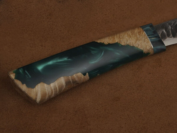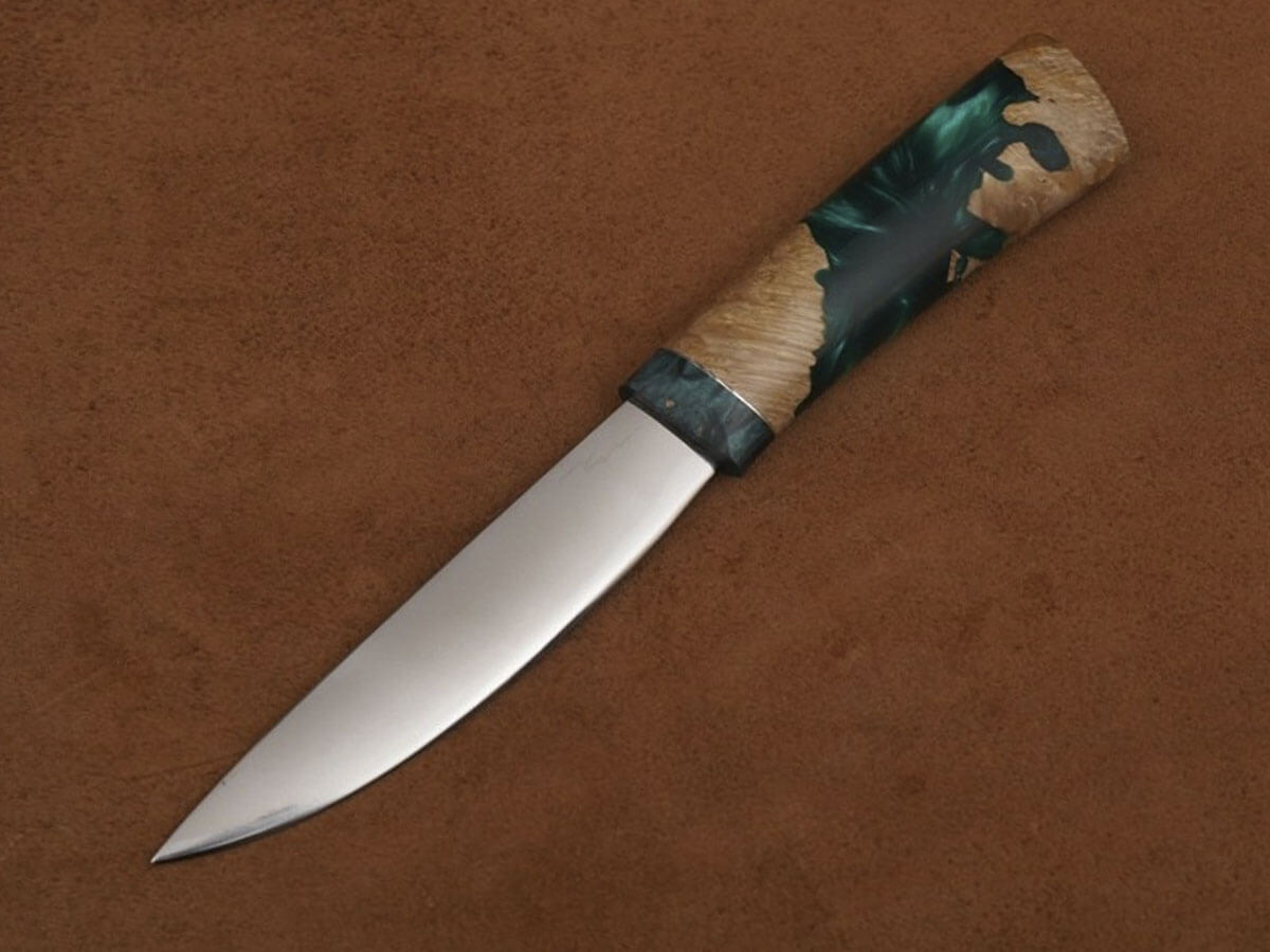 Плотная рукоять не скользит в мокрой ладони, брать ее в руку удобно и приятно. Рисунок дерева всегда уникален и делает эксклюзивным каждый экземпляр ножа. Следует помнить, что отсутствие гарды требует внимания в работе: при неосторожном обращении пальцы могут сползти на лезвие и получить порезы.