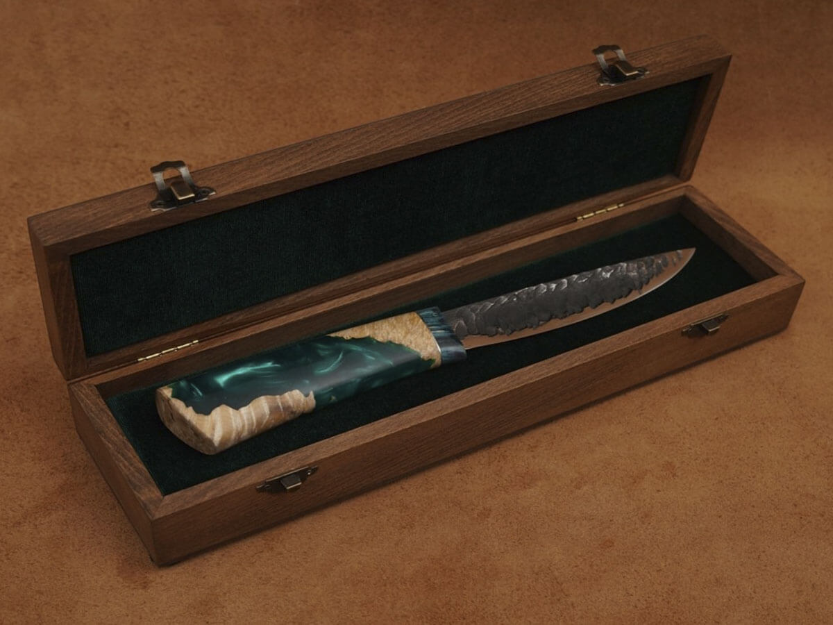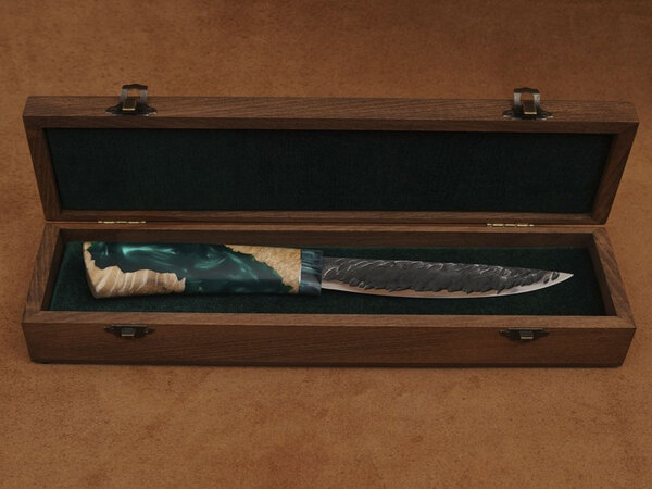 Внутренняя подложка выполнена из зеленой бархатной ткани. Большой стальной нож в такой шкатулке смотрится очень эффектно и выглядит еще более солидным и внушительным.