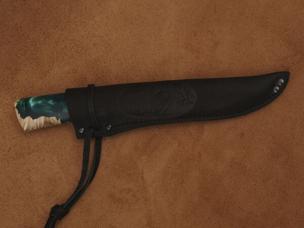 Нож оснащен крепкой рукоятью из мореной карельской березы – красивого прочного материала, который не боится влаги и холода, не рассыхается, не трескается на морозе и умеет удерживать тепло даже при минусовой температуре. По сравнению с обычной мореная древесина отличается особой монолитной прочностью за счет долго пребывания в воде и имеет более темный и насыщенный цвет.