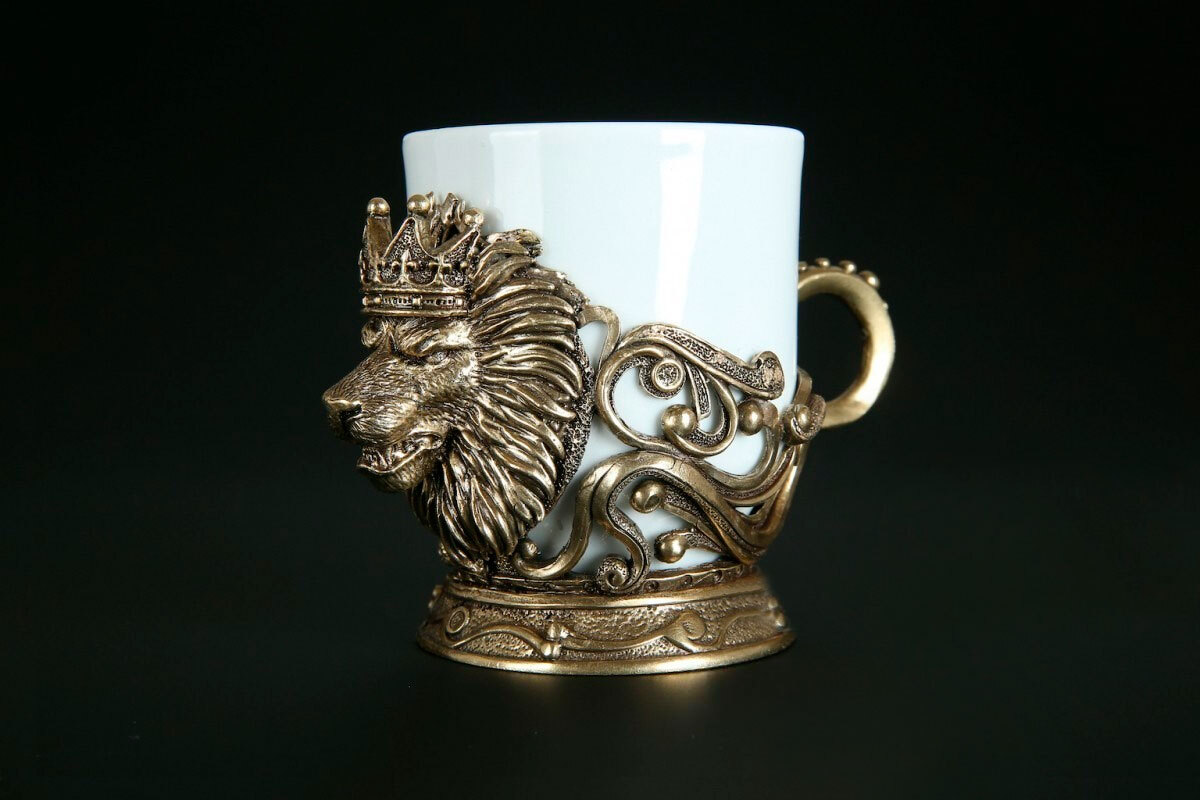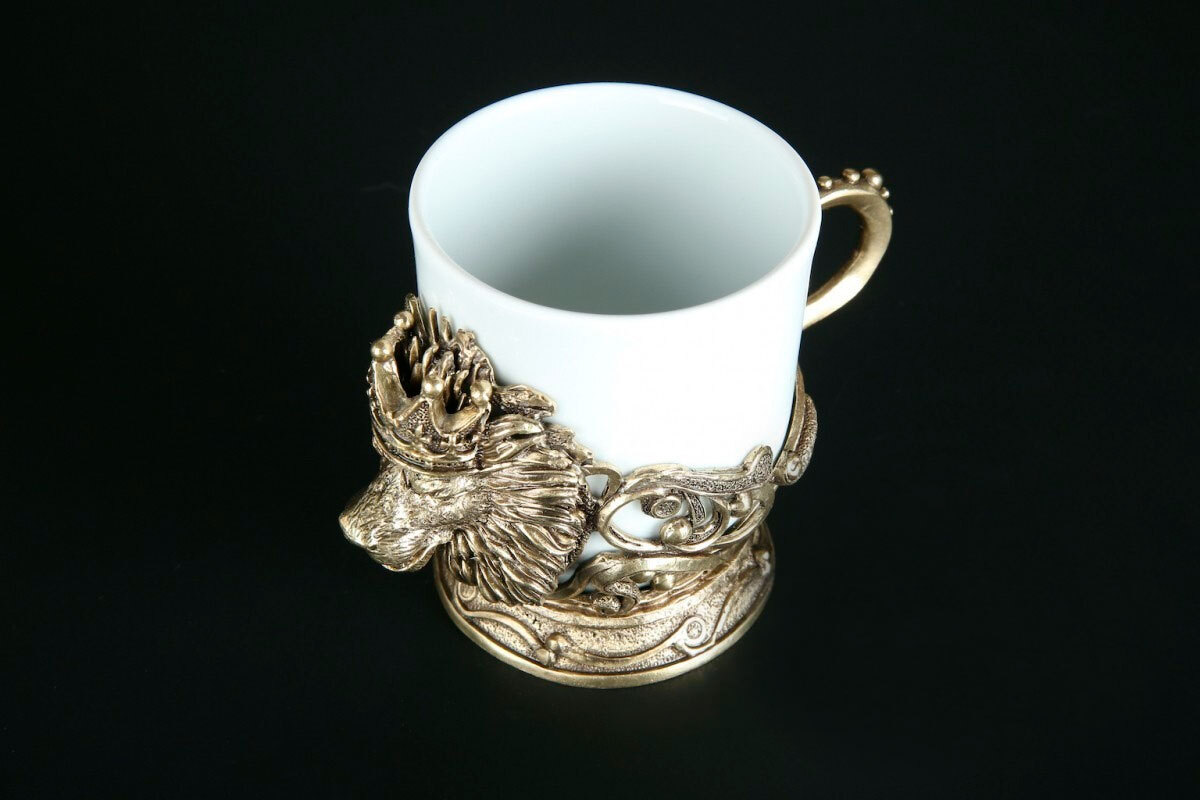 Чашка для кофе «Лев VIP» – это авторская модель с выразительным латунным декором и чётко проработанной композицией. Объёмная голова льва с короной придаёт царский характер изделию и сразу привлекает внимание.