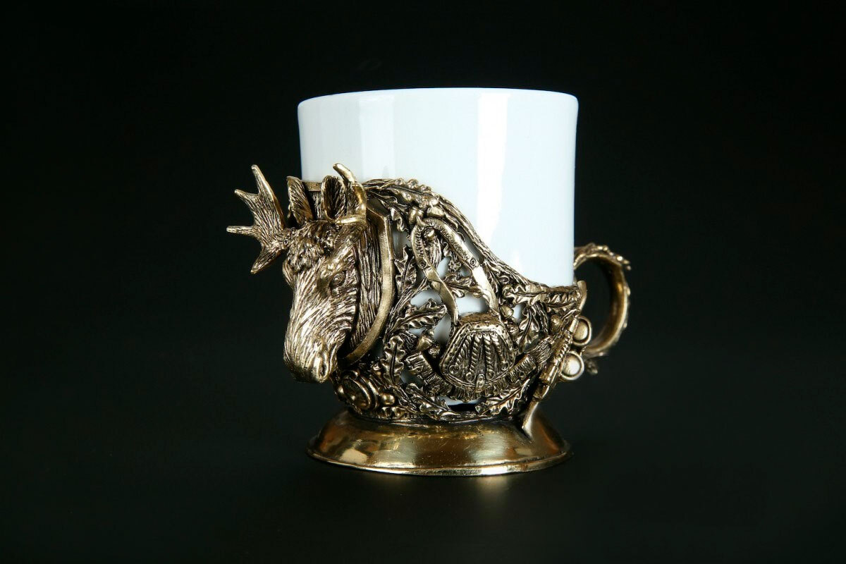 Латунная композиция выполнена с высокой точностью: чётко проработана фактура шерсти, рога, элементы окружения. Все детали читаются и выглядят объёмно. Металл и керамика образуют контраст, за счёт которого чашка выглядит выразительно и дорого.