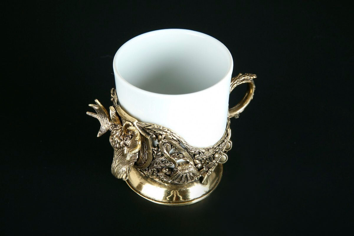 Основа чашки выполнена из керамики – материала, который хорошо удерживает тепло и комфортен в использовании. Декоративная часть изготовлена методом художественного литья из латуни.
