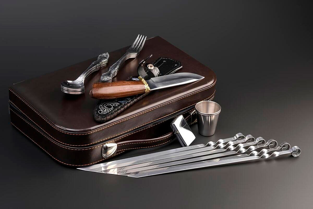 Шесть шампуров из нержавеющей стали позволяют быстро приготовить мясо или овощи на углях, а столовые приборы на четверых человек делают приём пищи удобным и аккуратным. Четыре стопки дополняют комплект и создают атмосферу дружеского отдыха на природе. В набор также входит бензиновая зажигалка, которая пригодится для розжига костра или мангала.